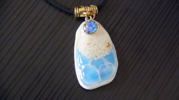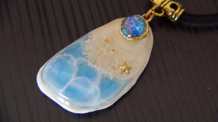 北海道の南、松前町の浜で採れた貝がらに、海模様のレジンコーティングをしてネックレスに仕上げました。